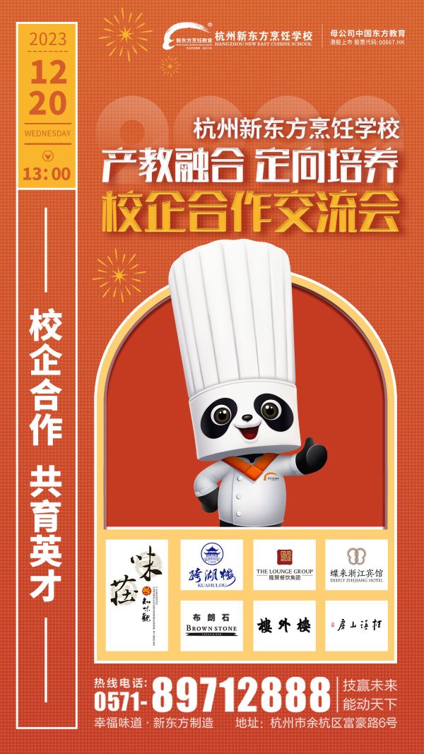 杭州新東方職業(yè)學(xué)校將于12月20日下午召開(kāi)2024年“產(chǎn)教融合,定向培養(yǎng)”校企合作推進(jìn)交流會(huì)。本次會(huì)議將邀請(qǐng)杭州跨湖樓餐飲有限公司 、浙江賓館有限責(zé)任公司 、杭州知味觀味莊餐飲有限公司 、杭州桂語(yǔ)山房餐飲有限公司 、杭州樓外樓實(shí)業(yè)集團(tuán)股份有限公司 、浙江隆聚餐飲集團(tuán)股份有限公司、 上海布朗石餐飲管理有限公司,攜手推進(jìn)產(chǎn)教融合的發(fā)展,提高人才培養(yǎng)的質(zhì)量,共同探討產(chǎn)教融合的新模式和新路徑,為學(xué)生提供更多的就業(yè)機(jī)會(huì)和更廣闊的發(fā)展空間。
