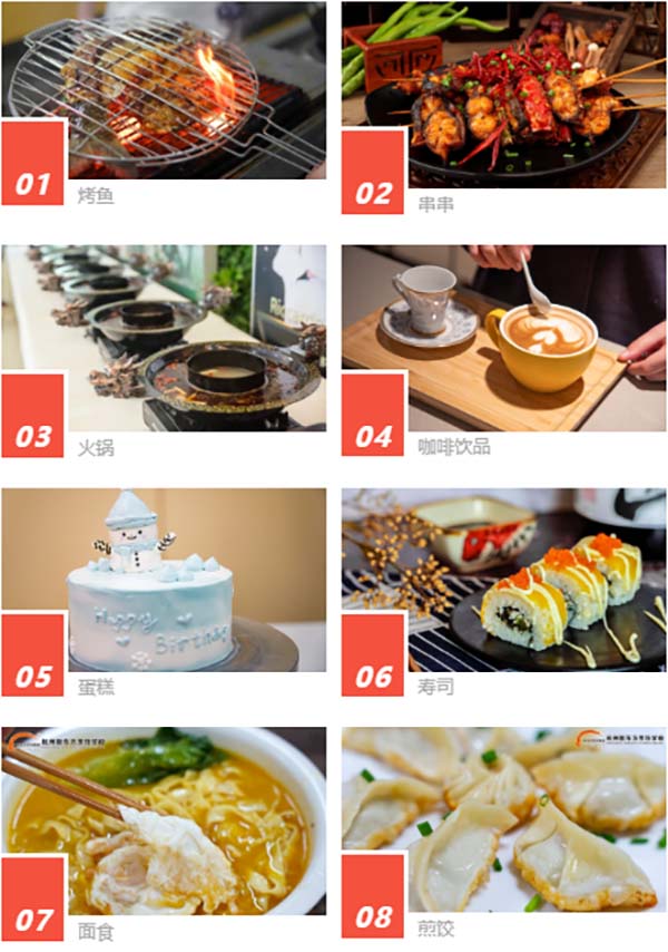 學(xué)習(xí)品種多元化:烤魚(yú)、火鍋串串、燒烤、咖啡飲品、小龍蝦、涼菜、熱菜、蛋糕、裱花、烤鴨、麻辣燙、壽司、面食、早餐等,應(yīng)有盡有!