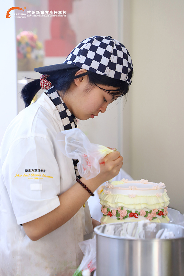 西點賽區(qū)的學子們同樣不甘示弱。她們手持裱花袋,如同藝術(shù)家般在蛋糕上揮灑著創(chuàng)意。細膩的奶油在她們的巧手下變成了栩栩如生的花朵、可愛的卡通形象,每一個細節(jié)都處理得恰到好處。