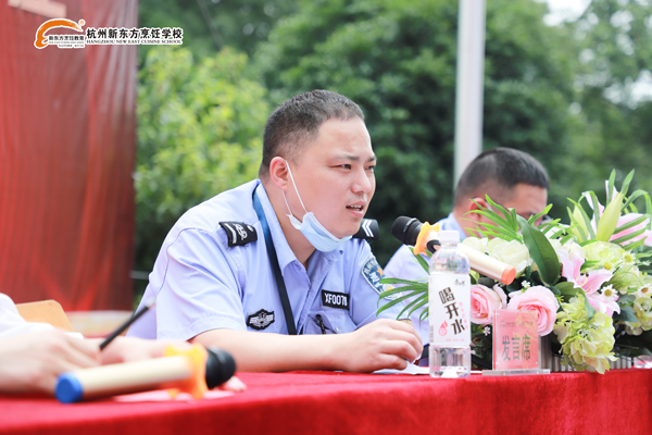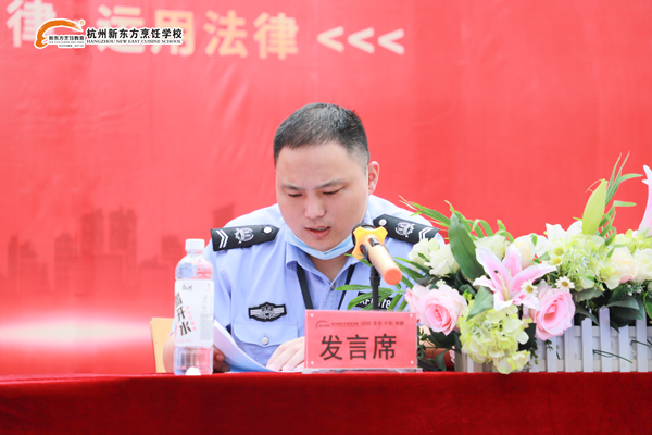 杭州新東方烹飪學(xué)校校領(lǐng)導(dǎo)上臺做重要講話。首先感謝公安民警們的到來,向?qū)W生提出幾點要求,希望學(xué)生學(xué)法守法,規(guī)范自己的行為,樹立遵紀(jì)守法的法治理念,共同努力創(chuàng)建平安校園。