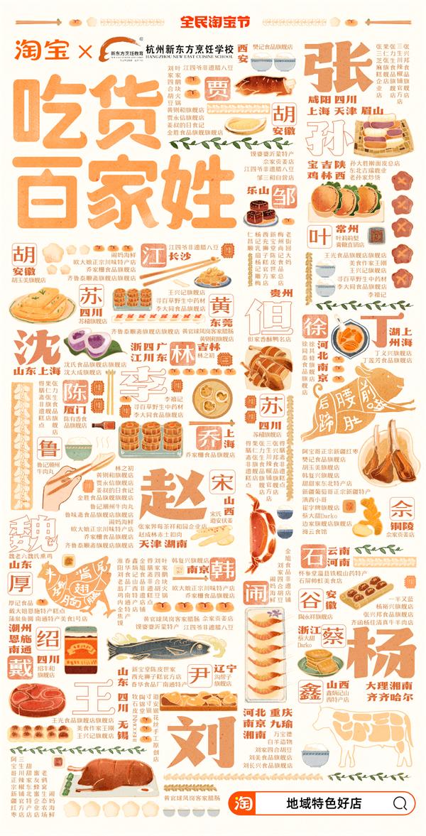 淘寶在雙十二期間整理了一份吃貨百家姓圖鑒,匯聚了許多以姓氏命名的地方特色美食,讓你足不出戶就能嘗遍全國地域美食!