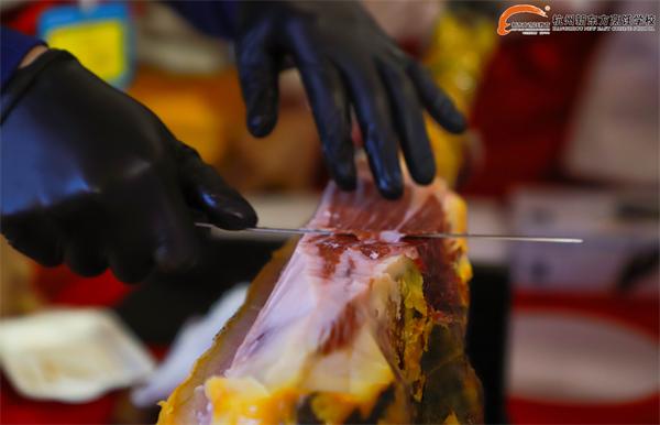 現(xiàn)場(chǎng)切腿師唐志剛示范講解了火腿的片制手法與注意事項(xiàng),可以看到他把火腿切得肥瘦相間、薄如蟬翼。而后他又對(duì)火腿部位進(jìn)行分析,他講到腿背的肉較瘦,但是彈性十足,嚼起來(lái)有滋有味;腿內(nèi)側(cè)的肉油脂豐富,肥潤(rùn)馥郁,吃的時(shí)候不能少了好酒;靠近腳蹄的部分肉質(zhì)嫩滑輕盈,獨(dú)有一種別致的鮮味,但切的時(shí)候得避開(kāi)筋。職業(yè)片火腿師技藝見(jiàn)功力,其實(shí)不止是簡(jiǎn)單的這么一片一片地切,而是一整只生火腿擺在你面前時(shí)的‘開(kāi)腿’工作。