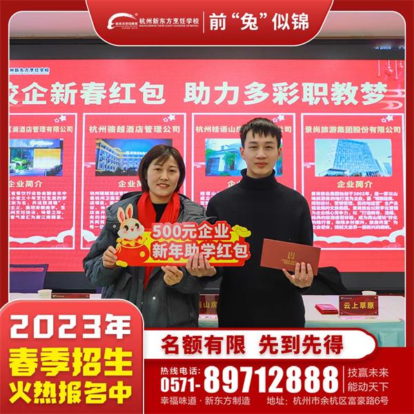 正值開學(xué)季,為助力大家實(shí)現(xiàn)技能成才夢。近日,杭州新東方職業(yè)學(xué)校攜手杭州君潤茗瀾酒店管理有限公司、杭州駱越酒店管理公司、杭州桂語山房餐飲有限公司、景尚旅游集團(tuán)股份有限公司四家企業(yè),現(xiàn)場派發(fā)校企新春紅包,歡迎新生學(xué)子報(bào)名入學(xué)。