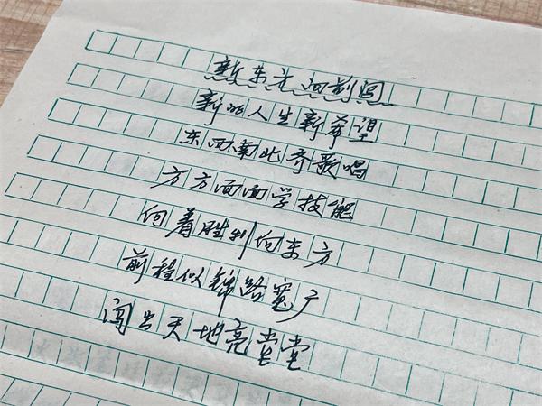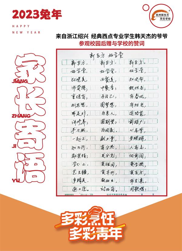 在朋友的幫扶下他們來到了杭州新東方職業(yè)學(xué)校,參觀過后爺爺表示學(xué)校不管是教學(xué)實力、授課模式還是校園環(huán)境各方面都很好,給他留下了深刻的印象!朱爺爺回家后連夜寫下了三首打油詩,以此表達(dá)對學(xué)校的贊許和對孫子的厚望。