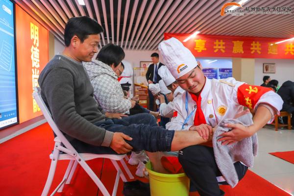 參觀結束,同學們?yōu)楦改笢蕚淞俗约河H手制作的美食佳肴,向家長們展示從入學以來自己的學習成果,用真正的技能感恩、回報自己的父母。當孩子們端著一盤盤色香味俱全的美食,來到父母身旁,手挽手一起走上紅毯簽名合影時杭小新看到他們的臉上露出了欣慰和自豪的笑容。