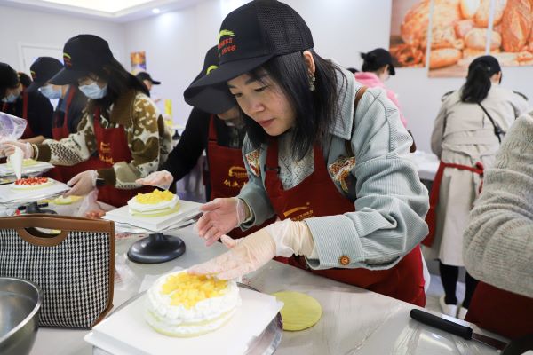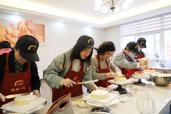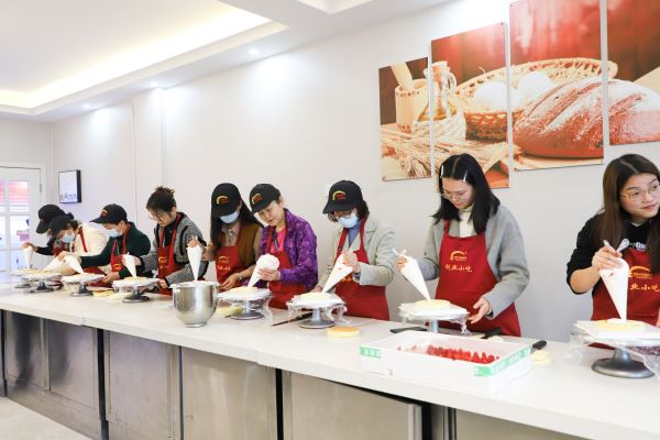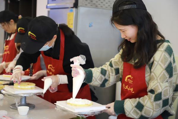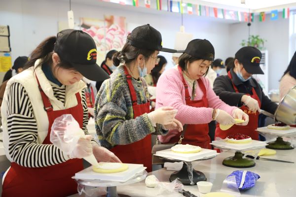 西點(diǎn)老師示范并指導(dǎo)大家從選用食材、配料、制作的工藝、裱花的處理等幾個(gè)方面進(jìn)行現(xiàn)場(chǎng)教學(xué),大家按照步驟將各自的蛋糕抹胚、裱花、定型、點(diǎn)綴水果,一個(gè)個(gè)令人垂涎欲滴的香甜蛋糕就制作完成了。