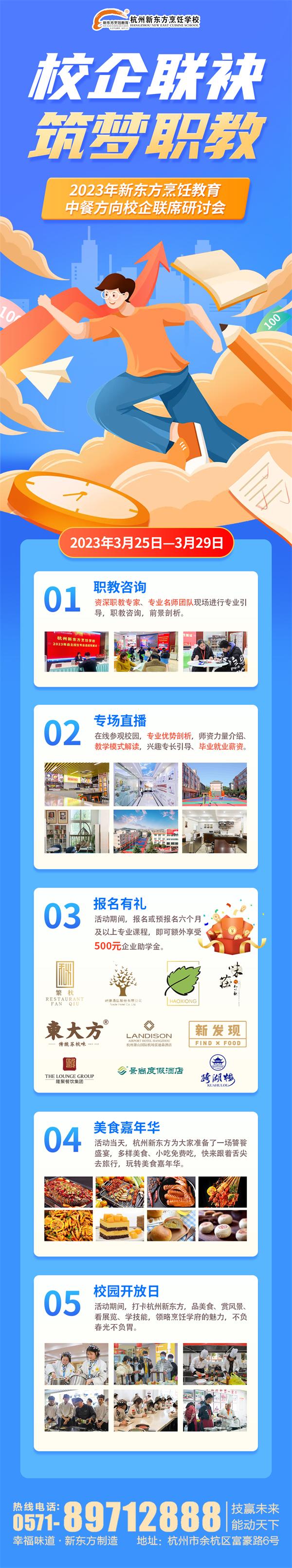 陽春三月,值此校企聯(lián)席研討會召開之際,杭州新東方給同學(xué)們送福利啦!3月25日-3月29日,來杭州新東方職業(yè)學(xué)校參加線下活動,游覽校園,隨堂試學(xué),多樣美食,免費品嘗,F(xiàn)場更有資深職教老師為大家答疑解惑;顒悠陂g報名即可額外享受500元企業(yè)助學(xué)金。無法到場的同學(xué)們也可以線上觀看專場直播,云游校園。