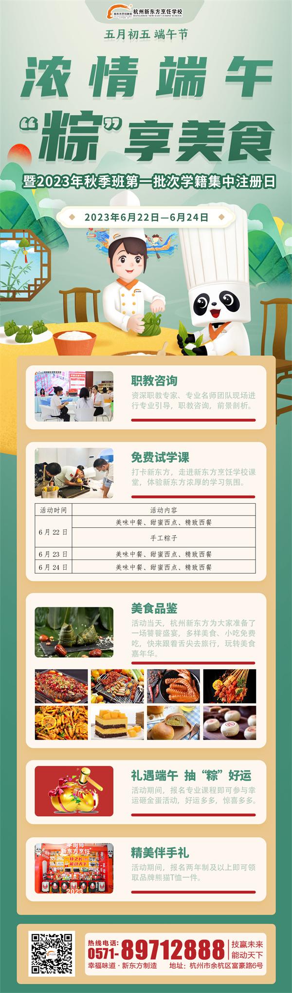 農(nóng)歷五月初五是中國的傳統(tǒng)節(jié)日——端午節(jié)。2000多年前遺留下來的習俗:掛菖蒲、賽龍舟、吃粽子、飲雄黃、佩香囊,讓大家充分感受到了這個節(jié)日所蘊含的民族情懷。國家對節(jié)假日的調整是對這些民俗類的非物質文化遺產(chǎn)保護的一種有效方式。值此佳節(jié),為了幫助更多有志青年實現(xiàn)自己的夢想,杭州新東方職業(yè)學校特開展“濃情端午·‘粽’享美食”暨2023年秋季班第一批次學籍集中注冊日活動,為廣大學子提供學習平臺,實現(xiàn)多彩夢想。