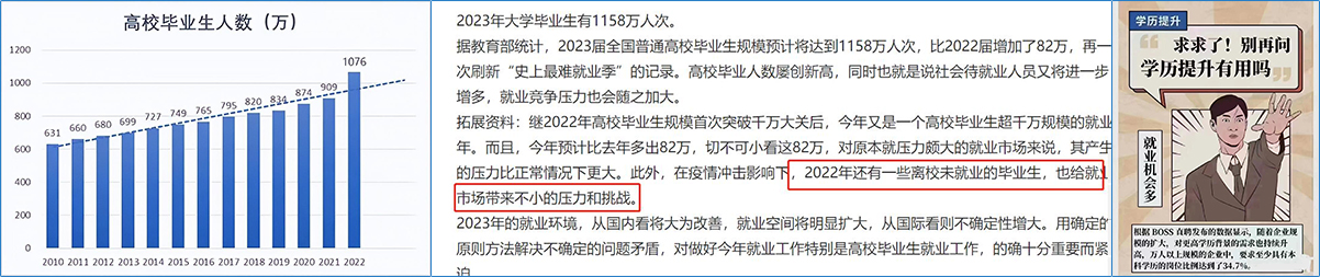 現(xiàn)狀一:高校畢業(yè)生(高職、大專、本科、研究生)人數(shù)逐年增加,2023年達到1158萬,本年畢業(yè)生與往年未就業(yè)人員導(dǎo)致社會就業(yè)壓力劇增,政府通過鼓勵中等職業(yè)學(xué)